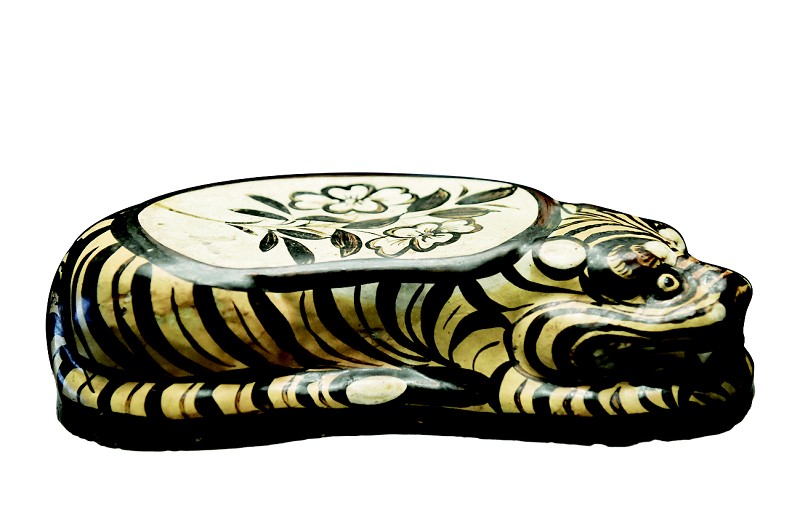 陶瓷虎枕是一种很有特色的生活用具,整体形状为一头老虎匍匐在地,张口怒目,獠牙切齿,在虎背椭圆形的空间内,花朵伸展盛开,老虎尾巴自然地弯曲在身体右侧,显得生动有趣。三彩虎枕,是瓷器艺术中的瑰丽奇葩。 记者 高万军 摄
