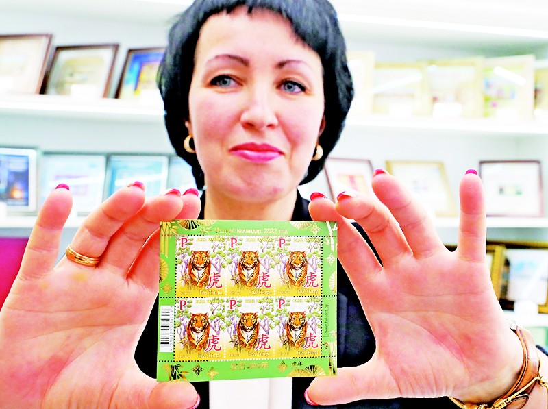 1月18日,在白俄罗斯首都明斯克,工作人员展示虎年生肖邮票。