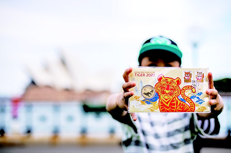 1月14日,在澳大利亚悉尼,一名孩子展示虎年生肖邮票和纪念币。澳大利亚邮政局近日推出虎年生肖邮票和纪念币,庆祝中国农历虎年的到来。 图片均据新华社