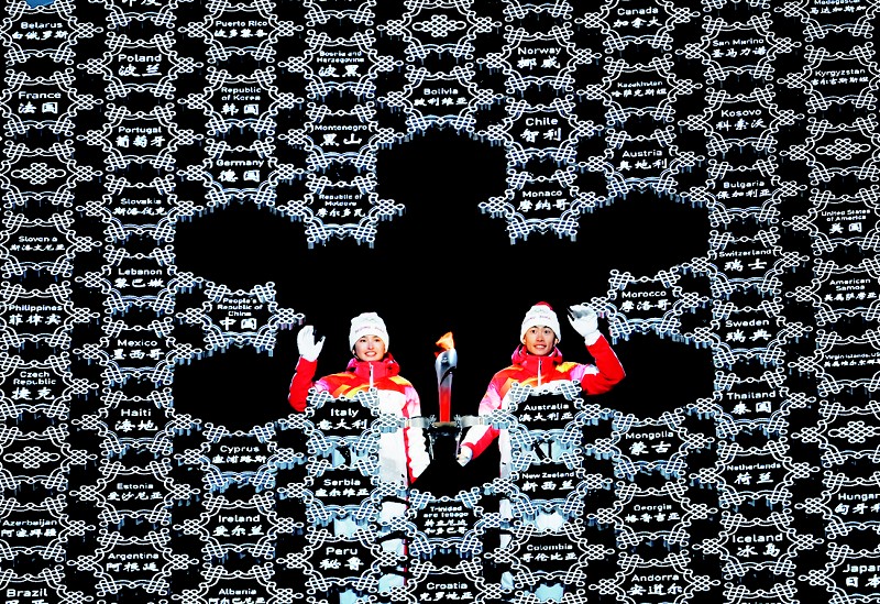 【致敬世界人民】在致敬人民的环节,来自世界各地的76名年轻人,同向同行、并肩向前,他们走过之处,形成一条由照片组成的影像长河,展现全世界休戚与共、共克疫情的画卷以及运动员为梦想拼搏的激情瞬间。“这是向全世界人民致敬,舞台两边的中国结象征着团结,而他们走过舞台后,又幻化为‘一起向未来’的冬奥口号。”张艺谋说。