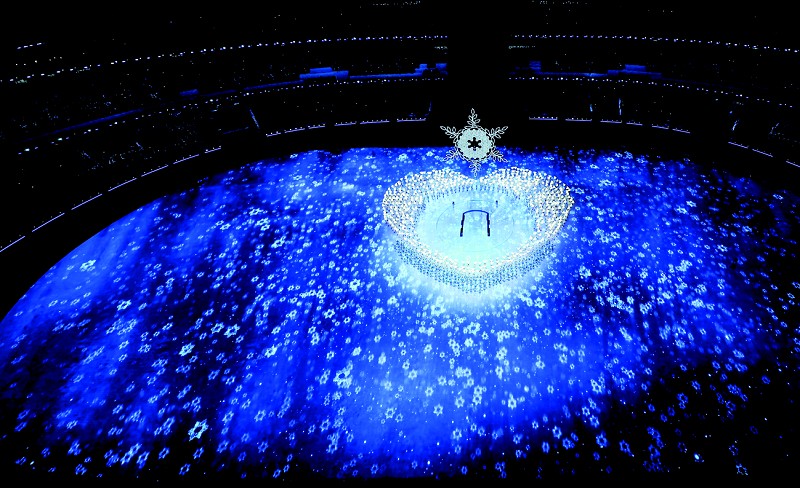 张艺谋用了一中一西两句话形容——李白的诗“燕山雪花大如席”和西方俗语“世界上没有两片雪花是相同的”。“这是我们精心设计的一种贯穿,每一朵雪花、每一个国家和地区汇聚在北京,就会成为一朵最璀璨的雪花。”“屏幕中,AR(增强现实)雪花在地球的映衬下同步下落汇聚,象征人类命运共同体的大雪花遨游天际,最终飞回地屏中心。在万众瞩目下,一个含有所有参赛国家和地区名称、长约15米的雪花形火种装置缓缓升起,浪漫纯洁、熠熠生辉,闪耀‘鸟巢’中央、直击观众内心,象征全世界人民紧密团结在一起。”开幕式视效总监王志鸥阐释道,“特别是在疫情下举办的本届冬奥会,这朵雪花讲述的不仅是‘我’的故事,更是‘我们’共同的未来,凸显人类命运共同体的重要意义,昭示全世界必须团结互助,才能战胜困难。”