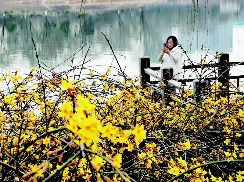 3月9日,太原市学府公园中心湖边的迎春花悄然绽放,吐露出朵朵嫩黄的小花。