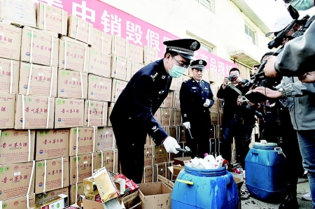 3月15日下午,太原市公安局联合市财政局和相关单位,在尖草坪区南岗村一库房院内举行集中销毁假酒活动,对2021年度以来经法院审结案件中查扣的各类假酒进行集中销毁。 记者 高万军 摄