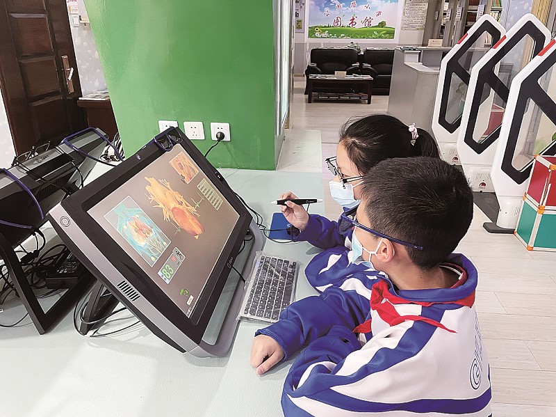 在图书馆大厅,有几位学生围绕在两台展示电脑前,走近一看,才发现学生们正在使用的是VR技术3D展示机。五年级一班的贺钰崇戴着3D眼镜,手握操作笔,电脑上的影像立马变得立体起来,3D象棋、3D筛子等影像内的物品皆可通过操作笔进行移动,物品还可以进一步进行放大,拆解。“当我点击心脏时,影像内的心脏跳动时,我手中的操作笔也跟着震动,我能感觉到自己真实的心跳,真是太神奇了。”贺钰崇开心地说。