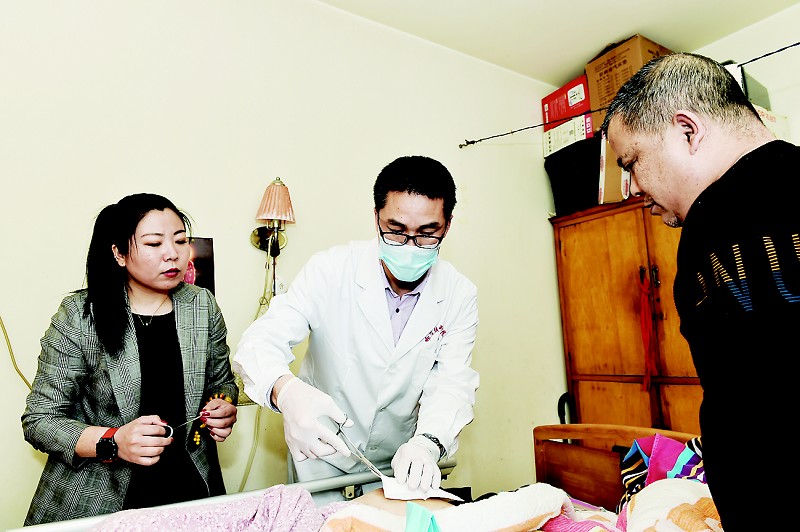 随后,他拿出换药包,给老人背部和臀部褥疮处敷上药,包扎好。在家人的感谢声中,宁智华走出了老人家中,前后用时近半小时。“老人的褥疮情况已经非常严重,全身共有五处,像这种情况很难康复,只能是勤换药减轻老人的痛苦。”宁智华说,每次上门为老人换药,他心里都五味杂陈,其实,作为家庭医生,能为老人们减轻病痛是大家最大的心愿。
