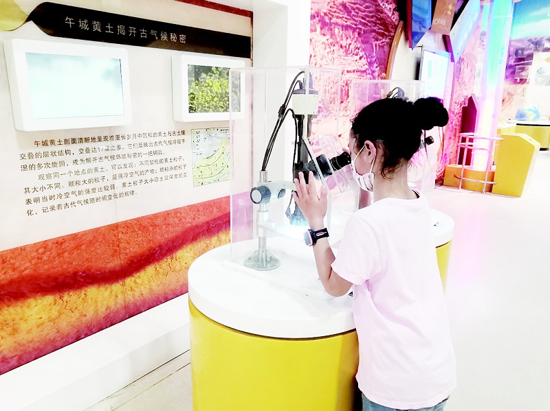 通过显微镜可以观察到,午城黄土每层的颗粒大小不一致,每一层黄土代表一个时间段,通过观察颗粒大小可判定当时的气候状况。颗粒较粗,代表当时气候较寒冷,风力较强,这样才能把粗颗粒的物质吹过来;颗粒较细,说明当时气候较温暖,风力比较弱,只能携带一些细小的颗粒。9岁的澄澄跑到显微镜前观察,兴奋地对妈妈说:“真的有大小区别啊!”