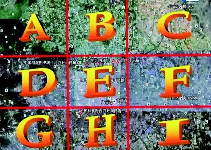 王珞丹在微博上发布了两张从她家往外拍的照片,网友首先分析出这是一个建成有一段时间的小区,院内有三个相同大小的正方形花坛,正方形连线的一段有一个俯视为长方形的拱门建筑。网友在Google Earth上截取了一张北京城区俯视图,按照四环为标准划分了9个区域。
