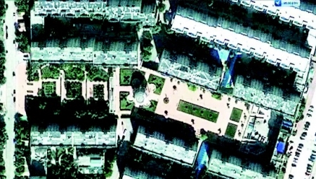 将C 区域俯视图局部放大后,可以发现图片上有3个正方形区域,再加上正方形区域边上的长方形区域,基本上可以确定这就是目标小区。