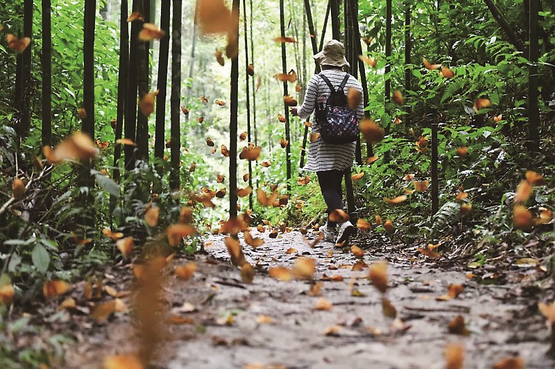 据云南大学国际河流与生态安全研究院副研究员胡劭骥介绍,金平马鞍底乡的山谷地形,有利于蝴蝶的聚集,上亿只蝴蝶集中在山谷狭小区域羽化,带来震撼的视觉效果。与此同时,当地生长茂密的中华大节竹为箭环蝶提供了充足的食物资源,使它的种群数量维持在较高的水平。