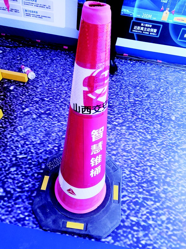 山西省交通运输安全应急保障技术中心的工作人员陶健带周鑫走进了模拟高速公路养护作业区。“您看到这个隔离墩了吗?它是一个智慧锥桶,里面装着一个芯片。这个芯片能探测到闯入隔离区的车辆。”陶健说,一旦有社会车辆闯入养护作业区,距离250米范围内,就会被这个芯片探测到。芯片会把探测到的信号传入附近的主机,主机就会发出有效定向声波,及时提醒上游的作业人员,有车辆闯入了。