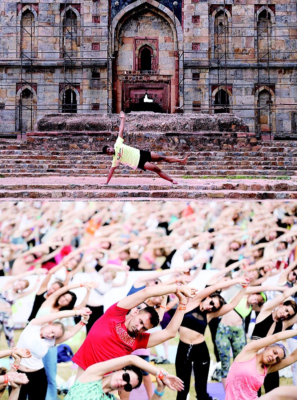 图③:上图为一名男子在印度新德里练习瑜伽;下图为人们在俄罗斯莫斯科练习瑜伽。