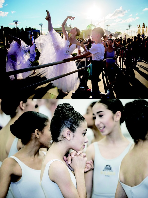 图②:上图为芭蕾舞者在俄罗斯莫斯科练功准备上“芭蕾大师课”;下图为在巴西若因维利市的莫斯科大剧院芭蕾舞团巴西分校,学生们观看老师示范动作。