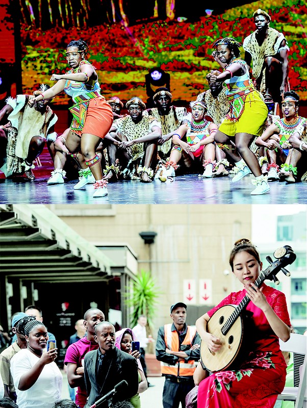 图①:上图为来自南非的演员在内蒙古呼和浩特表演《祖鲁歌舞》;下图为演员在南非约翰内斯堡“欢乐春节”文艺演出上表演节目。
