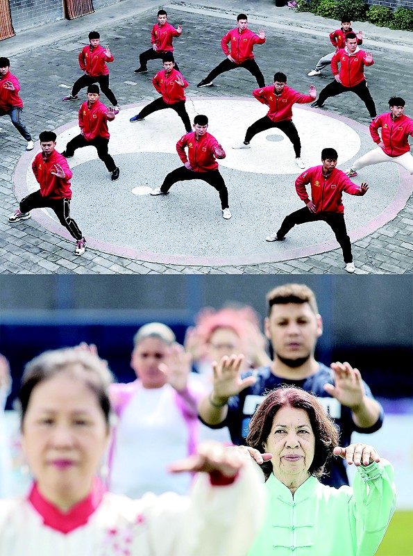 图⑤:上图为学员在河南省焦作市陈家沟练习太极拳;下图为人们在巴西圣保罗市参加中国太极拳学习表演活动。