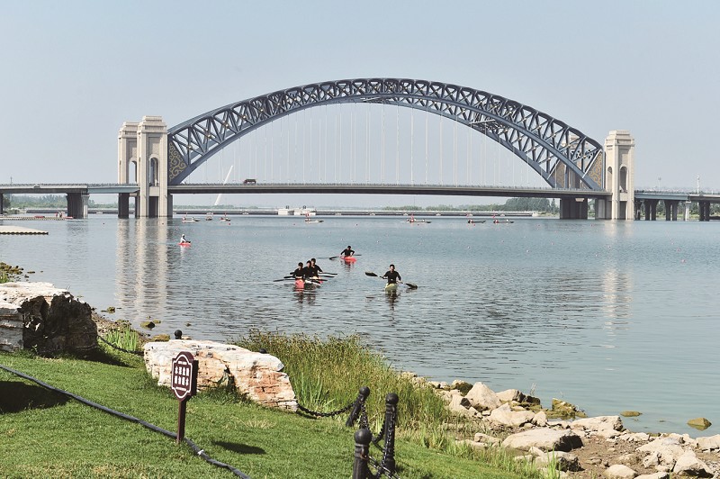 经过精心选址、设计、建造,汾河景区精心缔造出又一亮点——汾河晚渡。每逢傍晚,市民结伴而来,有的架起相机拍照留念,有的支起画板描绘美景,有的携手而坐欣赏夕阳……“这里的水面是华北地区最大的水上比赛、训练场地,岸对面就是太原古县城,这里是远离喧闹、坐观夕阳西下的最佳观赏地。”汾河景区讲解员告诉记者。