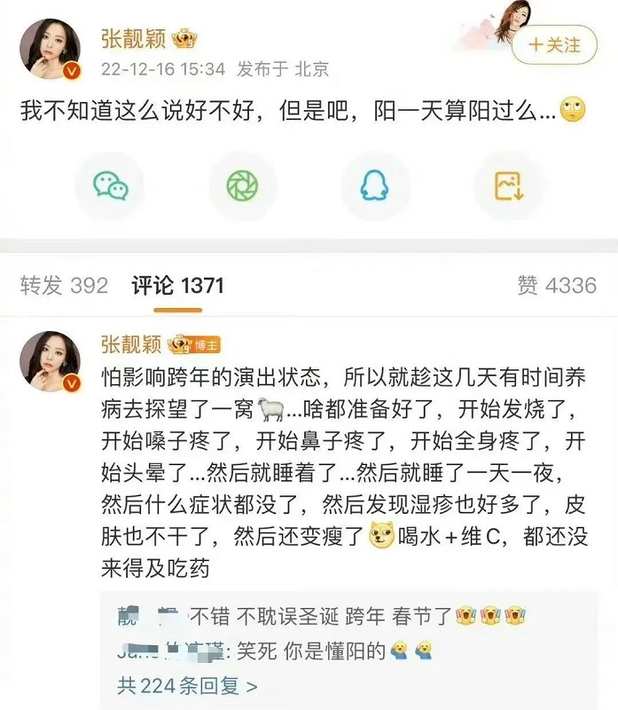 16日15时许,张靓颖发微博称“我不知道这么说好不好,但是吧,阳一天算阳过么……”