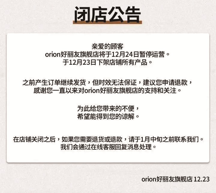 记者打开淘宝“ORION好丽友旗舰店”,原本应该是铺满商品的首页,只剩下“闭店公告”:12月23日下架店铺所有产品,12月24日暂停运营。