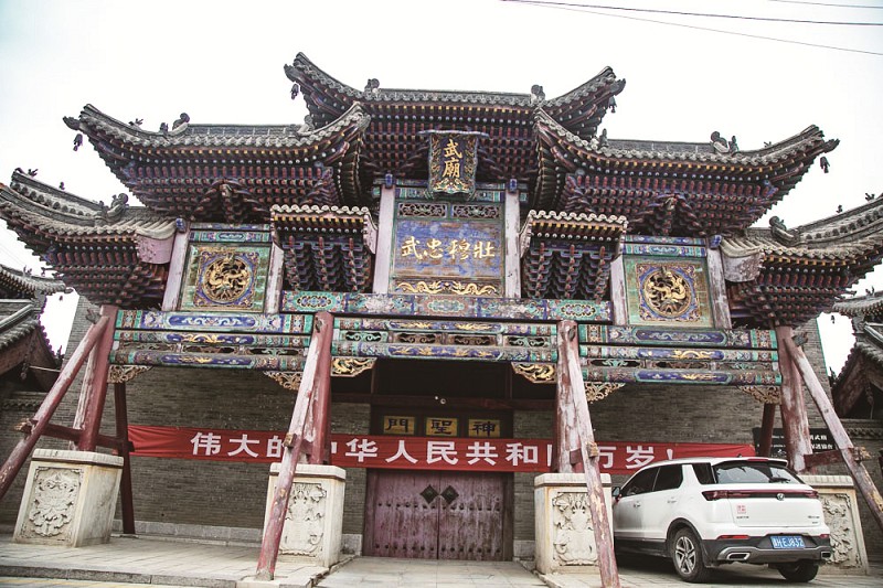 杨家祠堂坐北向南坐落在村中心,堂前有二座牌楼,斗拱飞檐,五彩流光,一座牌楼匾额前后写着“正谊”“明道”,另一座写着“廉垂”“四知”,8个大字特别耀眼,简洁的文字昭示着杨家的家风家规。如今,牌楼是村民们每天聚集的场所,祠门矗立于高高的石砌台基上,沿石阶而上,抬头即可见到祠门上悬挂的金字匾额:分别是“奕世将略”“一堂忠义”“三晋良将”。门楣上立着蓝底大匾,上有“忠武祠”三个金字,“忠武”乃杨业战死后,宋太宗给予谥号。台阶两边有一对吉祥镇宅石狮,门前高耸着两杆旗,非常引人注目。祠堂两厢有描述杨家将战绩的连环壁画,陈列着杨家将史迹相关文物。后院是祠堂的主体部分,东西厢房三间,正殿五楹,殿顶为悬山式。竖匾为“敕建”,显示祠堂是奉旨建造,横匾为“千秋忠义”“威镇华夷”“忠勋世美”。正殿内,正中塑着杨业与佘太君像,看到塑像那种饱经风霜、老而弥坚的神态,不禁令人肃然起敬。左右两旁塑杨令公八子及宋、元、明历代杨氏功臣名将像共二十尊,无不气宇轩昂,姿容伟俊,让人仿佛感到当年杨家满门保家卫国、血染疆场、英武不屈的忠烈风范。此外,祠堂内还保存有元、明、清多通碑碣,记述了杨家业绩和建祠经过。