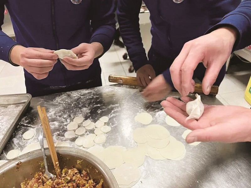 和面、做馅、擀皮、捏口,每个工序都装满了新训队对每一名队员的关怀。带队干部和队员们一起包饺子,大家分工合作,忙得不亦乐乎,整个餐厅弥漫着浓浓的年味和家乡味。不一会儿,一个个饺子在大家手中成形。韭菜鸡蛋馅、猪肉大葱馅、白菜大肉馅……满足了大家的不同口味。长的、圆的、扁的,造型各异,让大家参与美食制作的同时,也能从一件小事中感受到配合的重要。