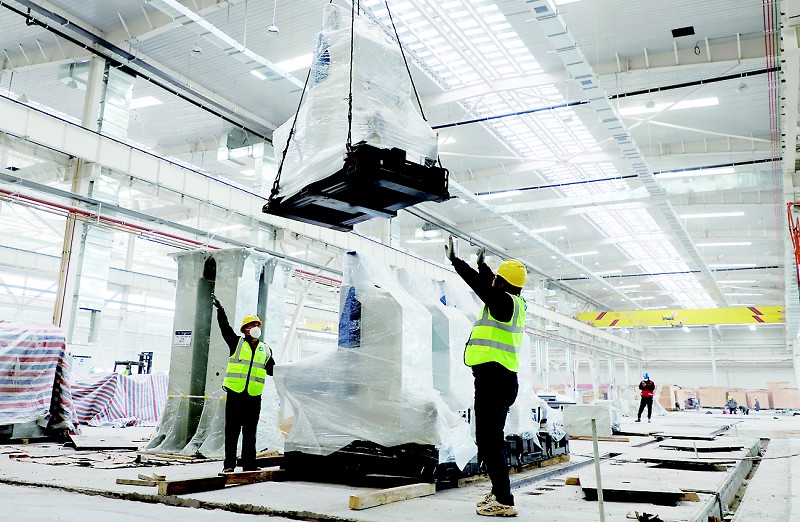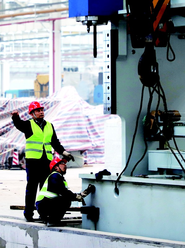 在大型联合车间建设加速推进的同时,超大挖掘机生产车间已“先声夺人”,开始进入试生产。走进超大挖掘机总装车间,工人们在各自的工位上忙着组装各种配件,厂房上空的行车不时缓缓移动,吊装底架、动臂、铲斗等部件,随着流水线向前推移,一台台黄色的大型挖掘机慢慢呈现。“这些挖掘机已经在集团各项目工地进行现场测试。”项目现场负责人表示,未来,项目全部建成达产后,标有“TZCO”字样的挖掘机家族将进一步壮大,并大量在市场上亮相。