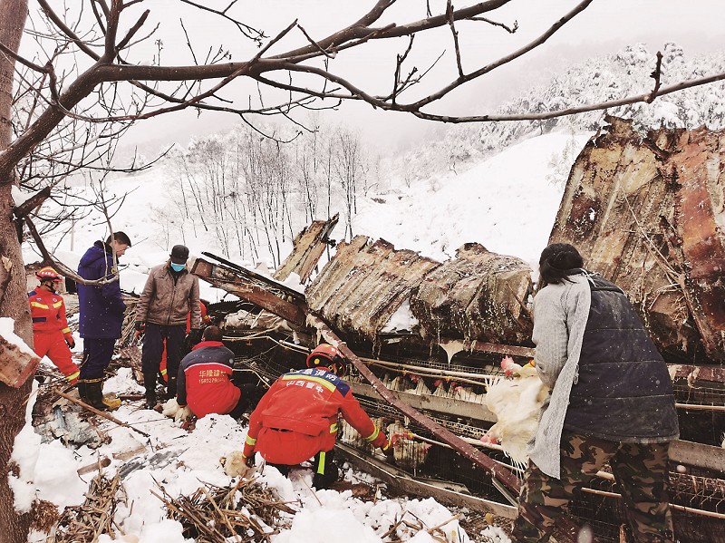 4月24日5时许,由于连续降雪,晋中市左权县拐儿镇关滩村一养鸡场鸡棚坍塌。
