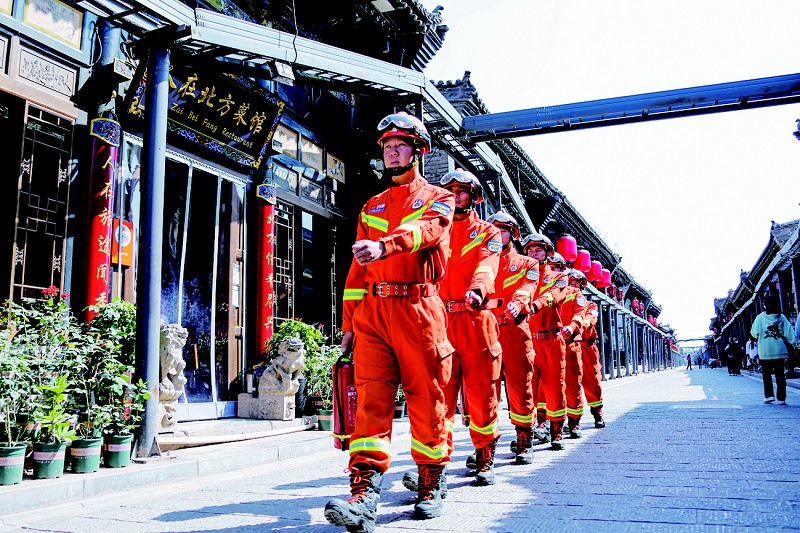 长期以来,平遥县古城消防救援站对标“主力军、国家队”职能定位,聚焦“全灾种、大应急”使命任务,始终坚持以战领训,实战实训,牢固树立战斗力标准,切实筑牢体能基础、强化业务素质、保障训战安全,助力专业化训练大提速、战斗力标准大提高、火焰蓝形象大提升。古城消防救援站心系百姓、服务驻地,先后荣获总队级、支队级“先进单位”“先进中队”“安全工作先进中队”“安全防事故先进单位”等荣誉,被共青团中央、原国家安全监管总局评为“全国青年安全生产示范岗”。他们圆满完成了“平遥中国年”“平遥国际摄影展”“平遥国际电影展”等系列消防安保工作。变“在家守”为“出去防”,全面推行勤务机制改革,着力向以“四入巡查”(入户、入铺、入客栈、入社区)为代表的多功能服务型勤务转变;实施消防安全“精准化”工程,将平遥古城划分为5个作战区域和41个防控单元,推动出台“一城两寺”等消防安全管理制度。