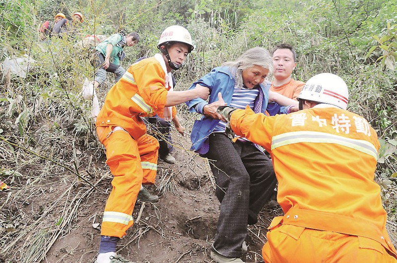 正在众人一筹莫展之际,五福村一位幸存老人告诉了我们一条重要线索:山上还有一条采药人走的小路,但已多年没人走过,一路上也是危险重重。“只要有一线希望,就要尽百分之百的努力。翻山!”指挥部马上召开干部会议,决定由太原支队组成35人的党员突击队,在向导的带领下,带两条搜救犬,沿山路先行进入茶坪镇侦察情况并展开救援。