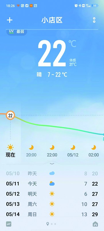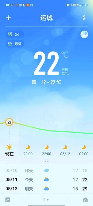 4.添加成功后,打开天气应用,往后翻页就可查看 “运城市”的天气。