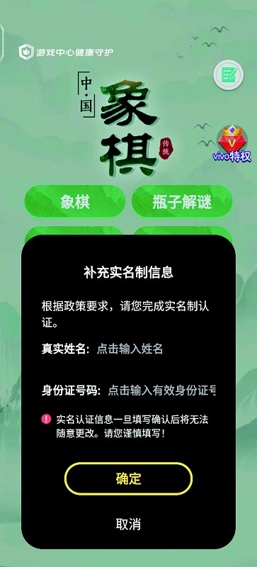 4.为防止未成年人沉迷网络游戏,进入该界面后,需要完成实名认证并确认,然后点击象棋就可以了。 记者 丁婷婷