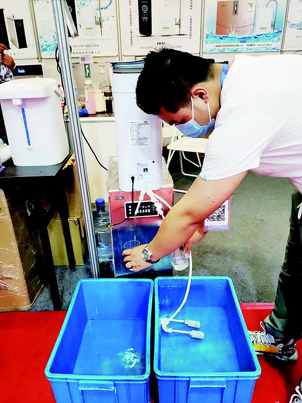 一台饮水机,两个出水口。一个口流出的水量大而且清澈透明,另一个流出的水量小且微微泛黄。许多市民站在饮水机前疑惑,两个出水管流出的水为何差异如此明显?“净水器,尤其是纯净水机,一度因废水太多令许多消费者望而却步。”工作人员介绍,这是一台废水比3︰1的净水机(也就是生产三杯净水,会产生一杯废水),这比许多废水比为1︰1或者1︰3的机器要节省很多水。