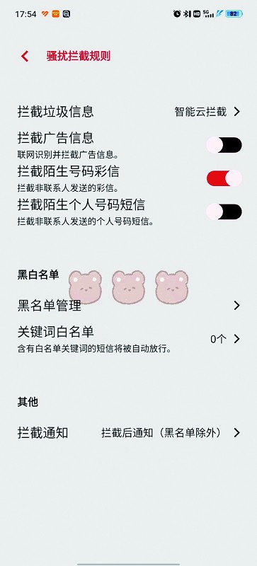 3.在该界面可以设置拦截广告信息、拦截陌生号码彩信、拦截陌生个人号码短信等。