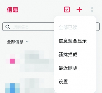 1.打开短信程序,点击右上角的两个“点点”(有的手机可能是“更多”),然后点击“骚扰拦截”。