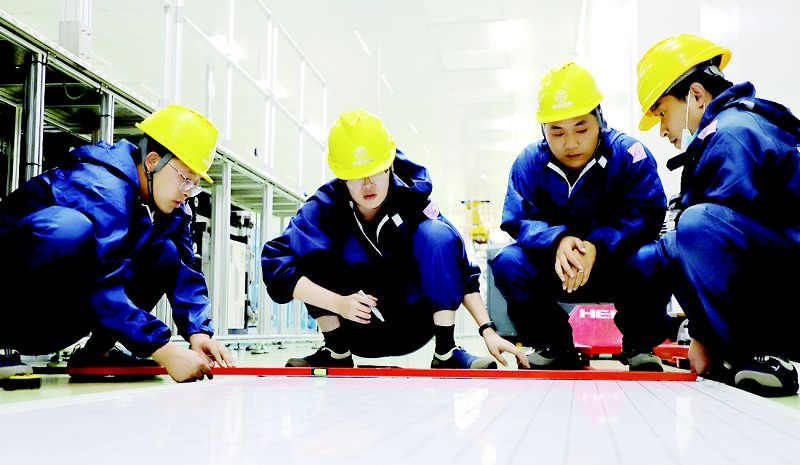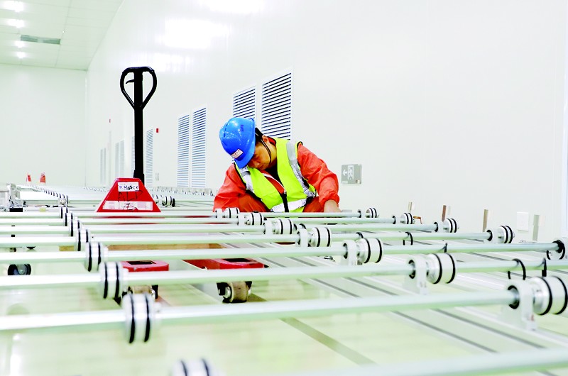 走进项目建设现场,2#车间周边道路已经硬化,工人们正在紧张地进行相关收尾工作。在7万多平方米的生产车间内,上百名工人身着防尘服分布在不同的区域内,正在紧张地进行设备安装。“光能电池的生产对于环境要求非常高,如果环境中的尘埃粒子较多会污染硅片,导致电池板无法正常生产出来,因此在设备开始进场时我们便对出入车间的人员、设备等进行严格控制,确保环境洁净。”山西中来光能现场工作人员介绍道。