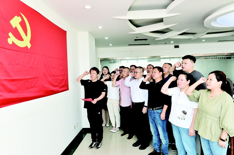 最后,由李喆同志领誓,中心全体党员在鲜红的党旗下重温入党誓词。