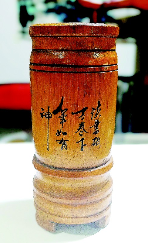 这个竹制笔筒差不多陪伴了叔叔几十年的教育生涯,即使叔叔换了几所学校执教,也一直带在身边,形影不离。平时,随手拿笔放笔,总能看一眼笔筒上刻的字,仿佛时时激励着自己为教育事业读书学习。
