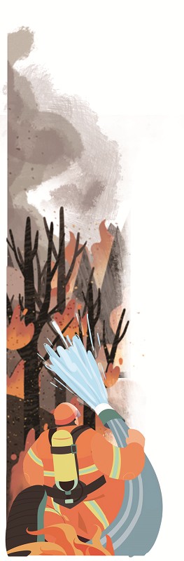 消防车里,费双旭见此情形,抓起一条毛巾,跳下车大喊:“浓烟上行,快趴下匍匐前进,防止窒息!”一边喊着,一边用毛巾捂住口鼻,冲到小战士身边,压倒他,用胳膊夹着他匍匐前行……