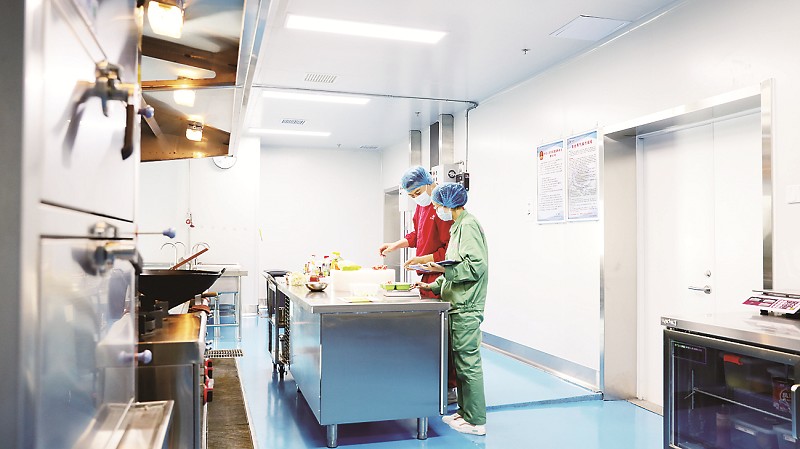 在不同的加工间和烹饪间内,臭氧消毒处理与电解水处理有效去除蔬菜和水果上的农药残留;毛刷清洗机负责清洗土豆、萝卜等蔬菜;切丁机、切片机会根据每日菜品搭配要求成片儿、丁儿、丝儿,效率极高。自动揉面机、拌馅机、智能蒸箱、自动翻转炒锅等高科技设备井然有序地工作,成分配比、操作规程由电脑程序执行最优计算,最大程度减少了人工干扰和污染。