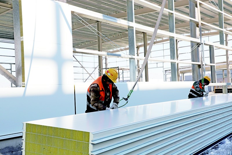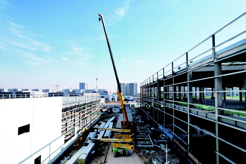 走进项目建设现场,材料运输车有序穿梭,曲臂自走升降车在工人的操控下沿着墙面上下移动。随着管理人员的指令声下达,大型吊车挥舞大臂将巨大的岩棉夹芯板稳稳地运到指定位置。“东区A05三代半导体技术创新中心试验验证中心建筑面积1.7万多平方米,A10综合库房近5000平方米,在山西综改示范区的大力支持下,从今年8月12日进场施工以来,不到三个月的时间就完成了主体结构建设。”中国电科二所现场负责人介绍,尽管时下已经入冬,仍有一百多名工人奋战在东西两区建设现场,加速推进项目。