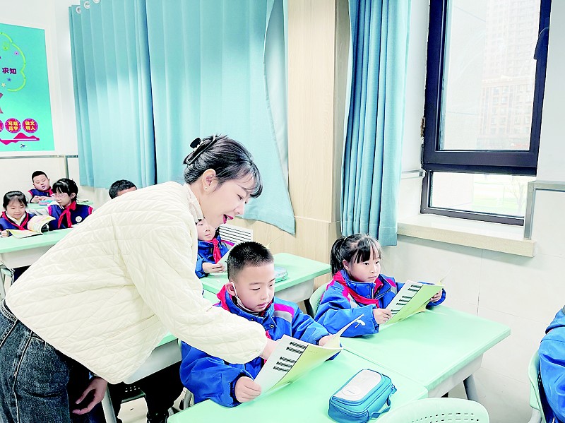 在长风实验小学的音乐教室里,郭赛灵活的手指在钢琴键盘上飞舞,弹奏出优美的旋律,还不时与学生互动交流,脸上洋溢着甜蜜的微笑,孩子们坐得笔直,眼睛里闪着求知的光芒。