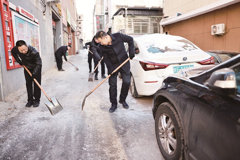 在滨河街道区委老干局巷和莲花池街道城内“六一”巷,廉海平、张海文等领导不畏严寒,与广大机关干部职工挥动着手中的铁锹,“专攻”积雪和冻冰,将冰雪铲起集中成堆。为了清理干净,大家有的用力铲,有的紧随扫,还有的负责把雪运送到装载机。
