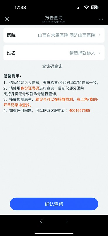 3.根据提示,选择就诊人,然后点击下方的“确认查询”。
