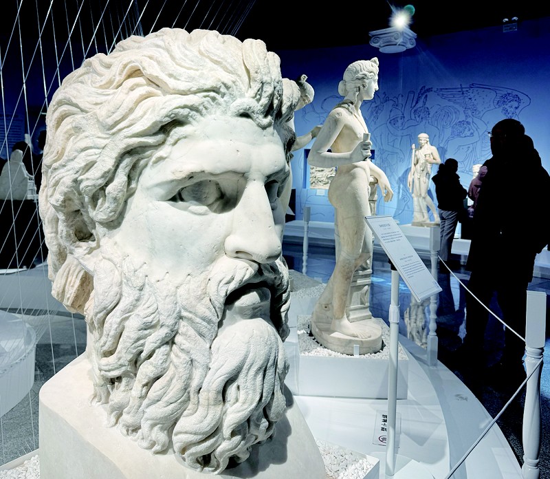 该展览汇聚了从古希腊到古罗马时期跨越千年的134件 (组)珍贵雕塑与艺术品,包括宙斯阿蒙头像方碑、普罗米修斯的惩罚石棺等精美文物,每一件展品都承载着深厚的文化底蕴和历史故事,向观众充分展示西方文明的辉煌成就。 记者 高万军 摄