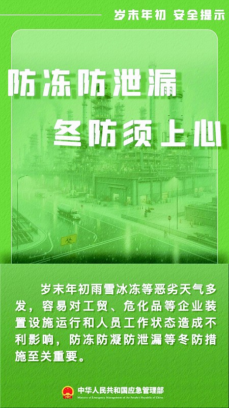 岁未年初雨雪冰冻等恶劣天气多发,容易对工贸、危化品等企业装置设施运行和人员工作状态造成不利影响,防冻防凝防泄漏等冬防措施至关重要。
