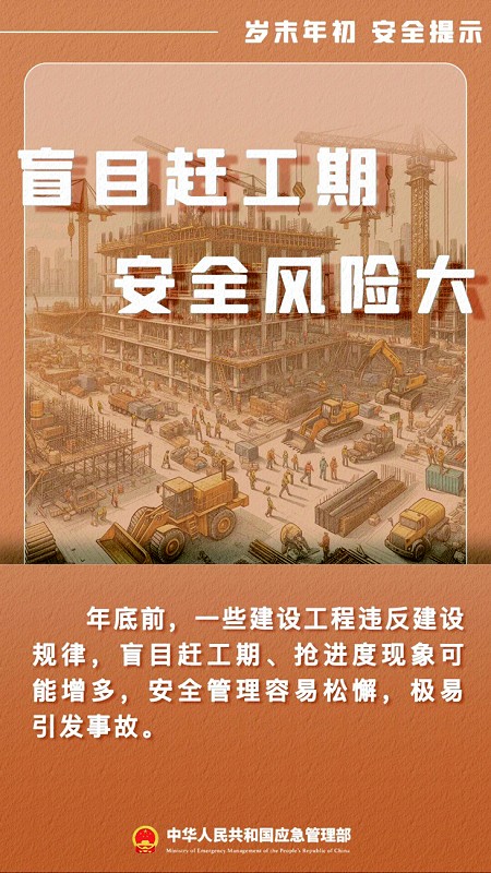 年底前,一些建设工程违反建设规律,盲目赶工期、抢进度的现象可能增多,安全管理容易松懈,极易引发事故。