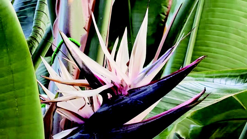 旅人蕉各叶的生命现象极为神奇有趣,通常每一成干长有20—22片大叶,两端的叶片因叶柄弯折角度较大,不利于持续的诞生和养分之输送补充。所以叶片的凋萎是自左右两侧开始,先是枯萎下垂一段时间后再断折,因此岁龄较长的旅人蕉,于其高直之茎顶两侧常可见到残留的已断折叶柄基部。 记者 高万军