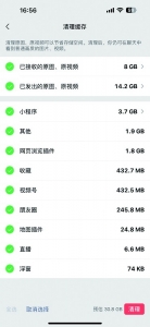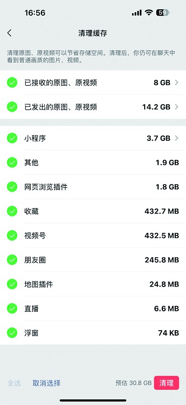 3.点击“去清理”,即可在清理缓存的同时,按需选择清理原图、原视频。清理后,仍可在聊天中看到普通画质的图片、视频。清理过程中可直接返回使用微信。