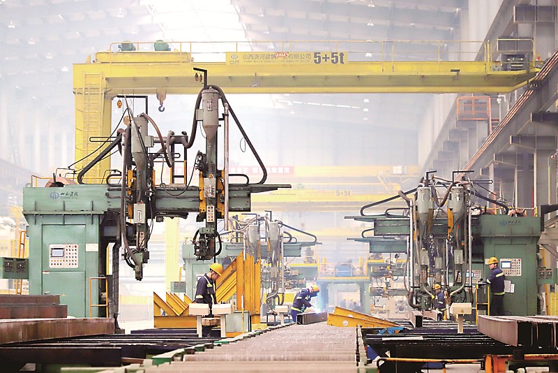 3月13日,在山西转型综改示范区山西建投潇河公司钢结构智能制造车间,弧光闪烁,机械轰鸣,箱梁、H型梁柱、管状构件、风电塔筒等在这里制作完成并发运。 记者 乔建彬 摄