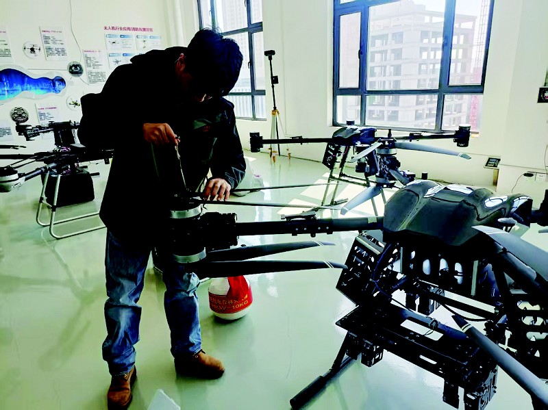 在菲特智能集团的无人机研发生产基地,一架架工业无人机如墨色鹰隼,静静待命。工作人员小李一边对无人机进行保养调试,一边向记者介绍:“我们的无人机适用于高空喷涂作业、玻璃幕墙清洗、光伏场站巡检清洗一体化作业以及森林防火无人机综合管理平台等关键领域。具备大载重、低速稳定飞行和强抗风性的特点,能够在各种复杂环境下高效作业,即使在无通信及定位导航信号的情况下也能自主规划飞行路径。例如这款无人机可以搭载50公斤的灭火弹,还可以对光伏板上的尘埃进行拂拭,达到精细化作业。”