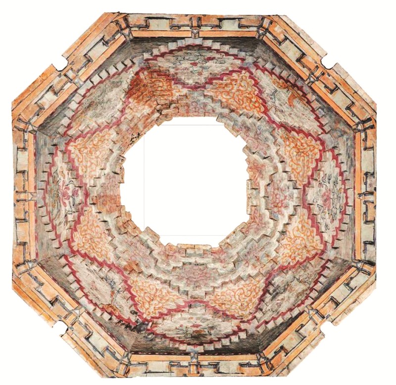 这座墓葬虽顶部局部受损,但整体保存状况良好。尤为引人注目的是墓室内的立体化艺术表现:下层北壁正中雕饰长方形窗,装饰“卍”字纹,窗的两侧各装饰一幅水墨卷轴画。墓室四壁转角处装饰绘有黑彩的四方抹棱柱。柱头上承五铺作斗拱出挑斡插垂柱,同时逐层叠涩五层内收;垂柱为四方抹棱柱,涂黑彩;铺作均施黄彩,并用黑彩与白彩勾画出构件边缘轮廓;中层以八边形结构营造木构建筑意象,十六组五铺作斗拱承托起精雕祥云纹饰;顶部五层斗八藻井层层内收,首层四面分绘“卧冰求鲤”等四则孝子故事,填补了该题材在晋南元墓中的空白。