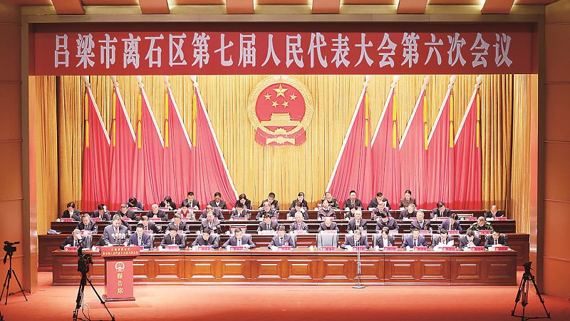 会议现场气氛庄重、热烈,主席台帷幕正中的国徽在鲜艳的红旗映衬下熠熠生辉。会场内,“坚持以习近平新时代中国特色社会主义思想为指导,奋力谱写中国式现代化离石篇章”的醒目横幅,鼓舞人心,催人奋进。